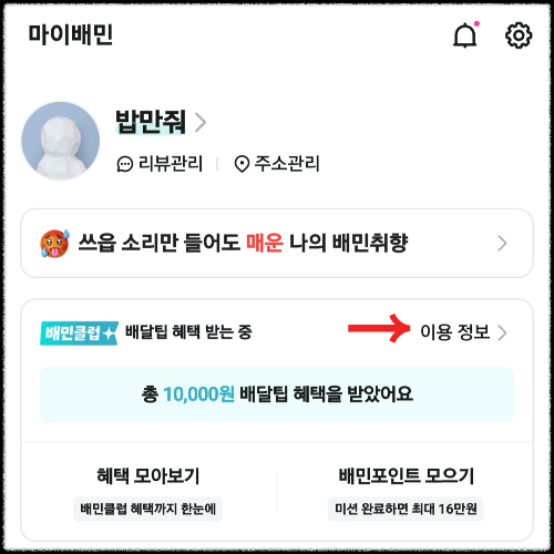 배민클럽 해지는 다시 한번 [마이배민] 메뉴로 돌아와서 위와 같이 "이용 정보"를 선택해줘야 합니다.