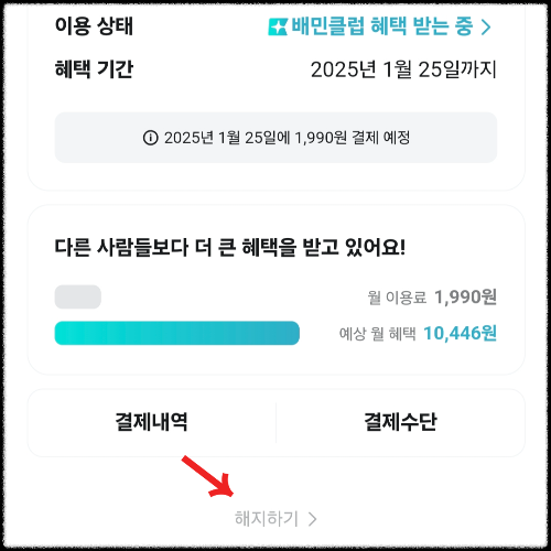 배민 클럽 이용 상태 및 혜택 기간 그리고 결제 예정일까지 담겨있는 이용 정보 화면에서 맨 하단을 보시면 "해지하기" 버튼이 있는데요. 글자색이 회색으로 되어있어서 클릭이 안 될 것 같지만 클릭을 해줍시다.