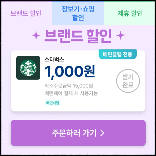 배민클럽 라운지로 이동하면 매주 다르게 적용되는 배민클럽 혜택을 살펴볼 수 있습니다. 크게 브랜드 할인, 장보기·쇼핑 할인, 제휴 할인 3가지로 나뉩니다. 브랜드 할인은 배달 주문 시 적용할 수 있는 쿠폰이 지급되며 대략 4~5천 원 정도의 할인 지원이 되기 때문에 타이밍만 잘 맞으면 요긴하게 사용할 수 있어 보입니다.