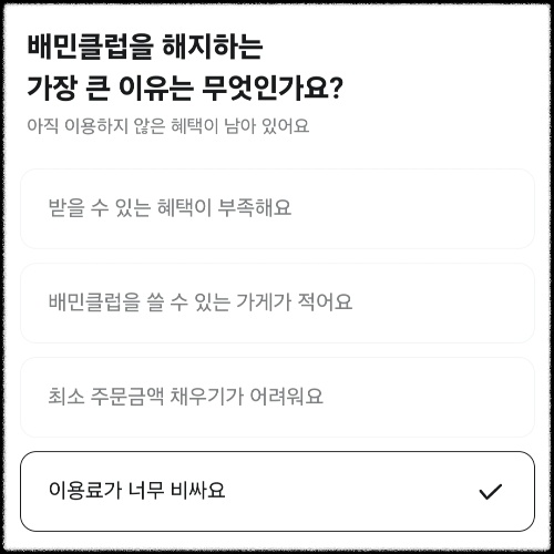 최종적으로 배민 클럽을 해지하는 이유에 대해서 선택해 볼 수 있는 화면과 마주하게 되는데요. 해당 보기란들을 참고로 선택하셔도 되고 안 하셔도 됩니다. 해지를 원한다면 맨 하단에 있는 "배민클럽 해지하기" 버튼을 선택하면 다음 결제일에 대금이 빠지지 않고 혜택도 종료되는 것을 확인해 볼 수 있습니다.