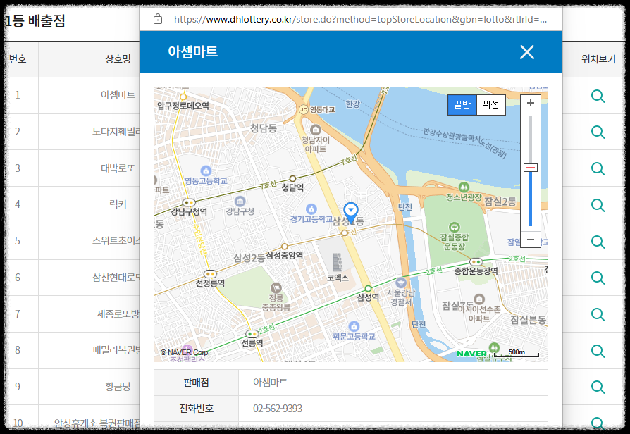맨 우측에는 "위치 보기" 버튼이 위치하고 있는데 해당 버튼을 선택하면 위와 같이 판매점의 자세한 정보 및 위치를 확인해 볼 수 있습니다. 매주 당첨지역이 안내되고 있는 만큼 정보가 쌓이면서 이른 바 로또 명당으로 거듭나는 판매점도 두루 소개되고 있습니다.