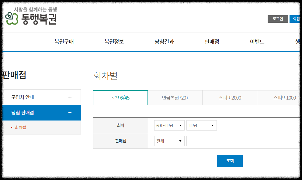 판매점 메뉴를 선택하면 좌측 사이드 탭에 "당첨 판매점" 메뉴가 위와 같이 확인될 텐데요. 해당 메뉴를 선택해 주면 되겠습니다. 이후에는 당첨 지역을 확인하고 싶은 복권 메뉴들을 확인해주면 되는데요. 많은 분들이 찾고 있는 "로또 6/45"를 예로 들기 위해서 "로또 6/45" 메뉴를 선택해 보도록 하겠습니다.