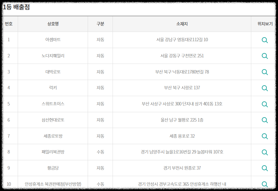 여기까지 로또 1등 당첨 지역을 확인하는 방법에 대해 소개드렸습니다. 해당 게시글 내용을 참고로 매주 발표되는 1등 당첨 지역 및 명당을 확인해 보시길 바라겠습니다.