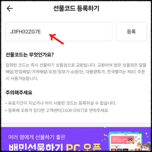 앞서 복사했던 배달의민족 쿠폰 번호 10자리를 위의 선물 코드 기재란에 입력 후 등록 버튼을 선택해 주면 되겠습니다.