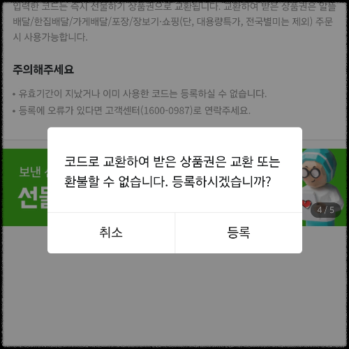 10자리 코드 기재 후 등록을 선택하면 위와 같이 알림 창이 띄워지는 것을 알 수 있는데요. 여기서 등록 버튼을 선택하게 되면 사용했던 10자리 쿠폰은 교환 또는 환불이 진행될 수 없는 상태로 변경될 테니 이용 시 참고하시길 바랍니다.