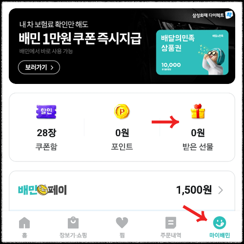 배달의민족 어플을 실행해서 메인 화면 우측 하단에 위치하고 있는 [마이배민]-[받은 선물] 메뉴를 위와 같이 순서대로 선택해 주겠습니다.