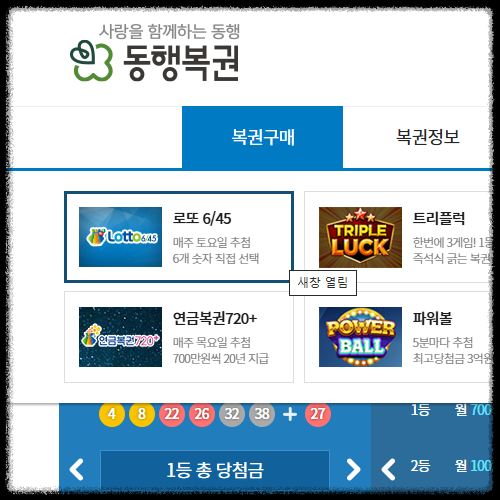 다양한 종류의 복권들이 있겠지만 매주 토요일 추첨하는 45 숫자 중 6자리 숫자를 맞추는 로또가 가장 보편적이라 할 수 있겠죠. "로또 6/45" 메뉴를 선택해 줍니다.