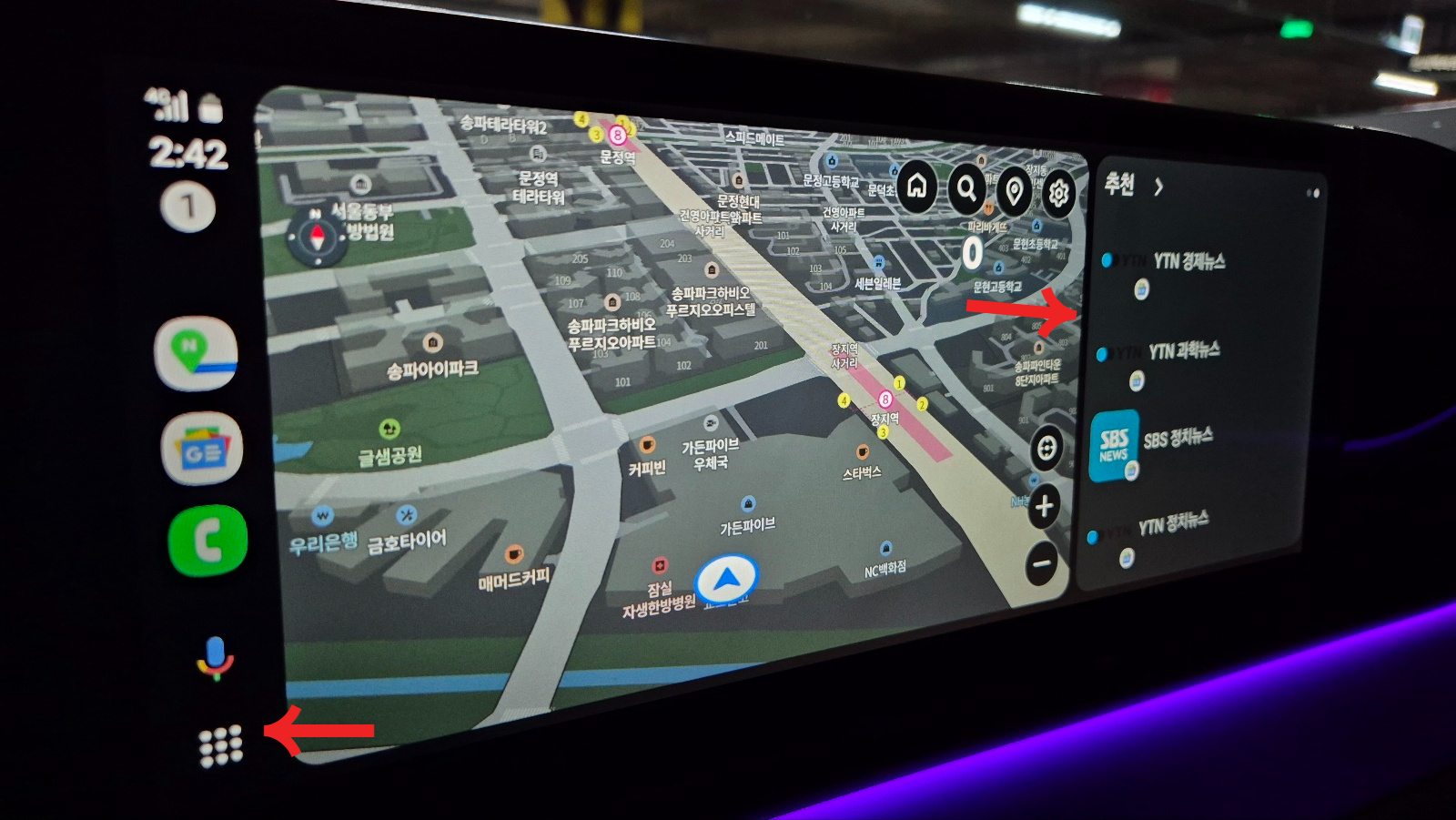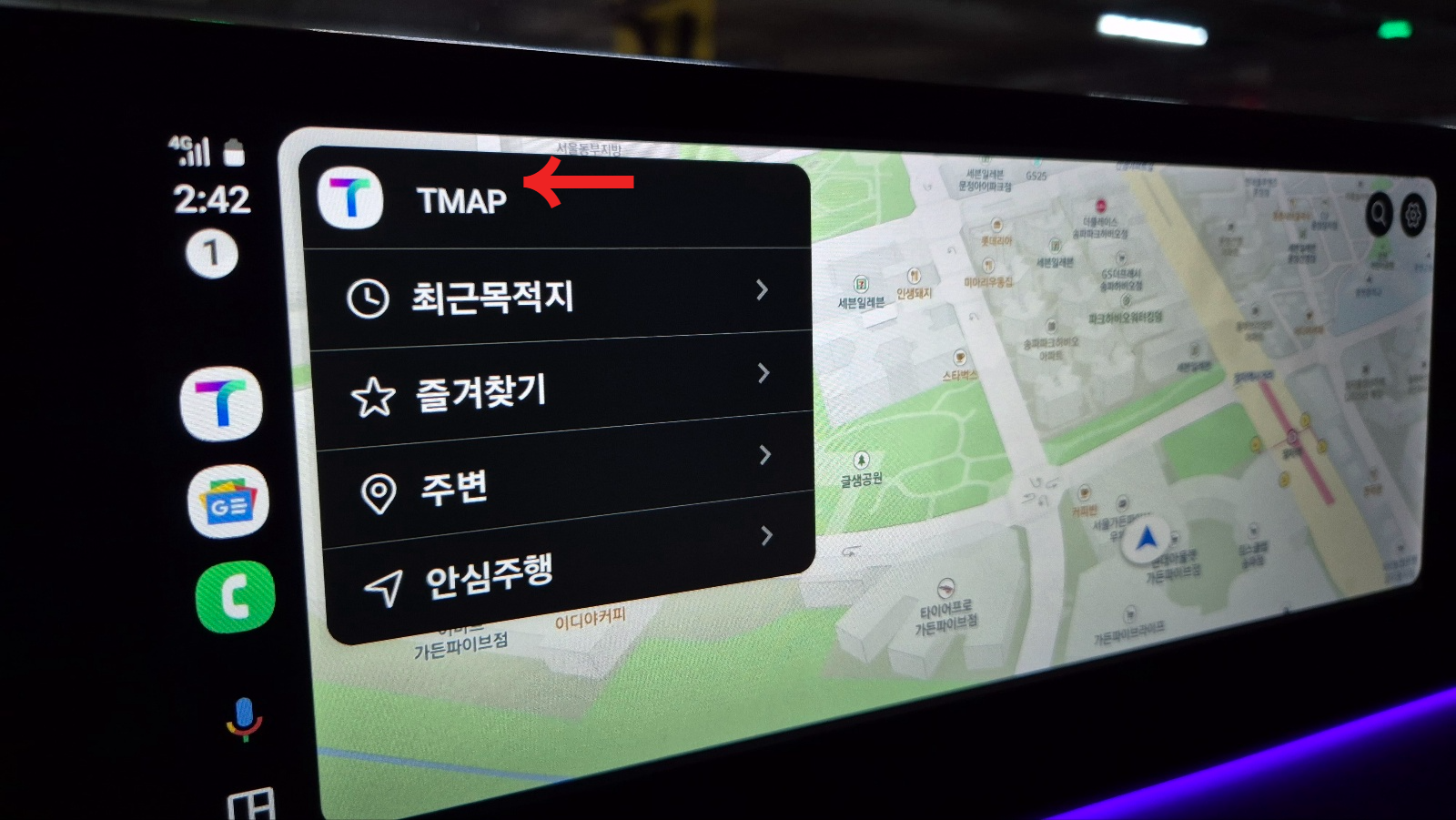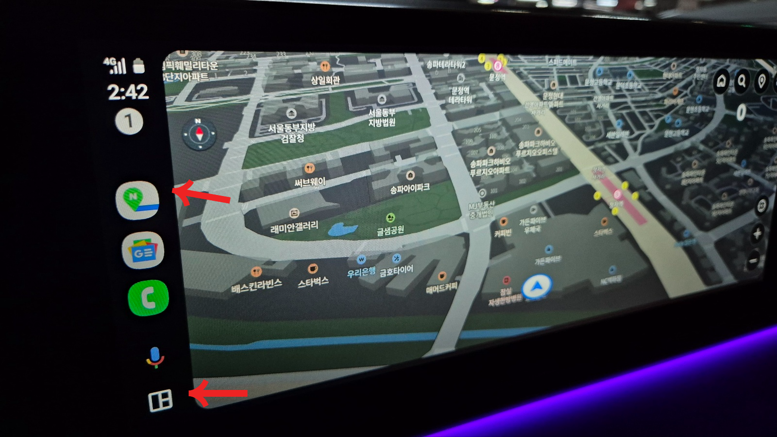 기존에 필자는 내비게이션을 "네이버 지도"를 이용하고 있었기에 위와 같이 디스플레이 내 내비게이션이 네이버 지도로 세팅되어 있는 것을 확인할 수 있다. 이 상태에서 티맵을 이용하려면 어떻게 해야 할까?, 방법은 간단하다. 좌측 맨 하단 마이크 아래에 있는 아이콘을 선택해 주도록 하자.
