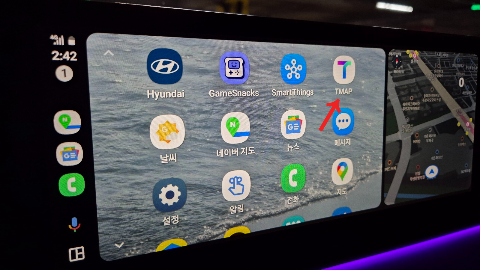선택과 동시에 연결된 기기 내 설치된 애플리케이션과 기기 배경 화면이 표기되는 것을 알 수 있다. 해당 애플리케이션은 사용자가 설정할 수 없는 부분이다. 이는 안드로이드 오토 애플리케이션에서 지원하는 애플리케이션만 맞춤 런처 설정 화면에 표기되고 있기 때문이다. 만약 티맵 혹은 네이버 지도가 맞춤 런처에 없다면 티맵, 네이버 지도 등의 관련 애플리케이션의 버전을 플레이스토어에서 업데이트받아 보거나 안드로이드 오토 재 연결 및 재 설치를 권장하는 바이다. 여하튼 표기되는 화면에서 티맵을 선택해 주도록 하자.