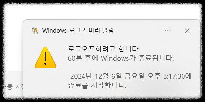 띄워진 cmd 창에 그대로 "shutdown -s -t 3600" 을 위와 같이 입력 후 Enter 키를 누르게 되면 명령어가 수행되는 것을 아래 알림 창으로 확인해 볼 수 있습니다.