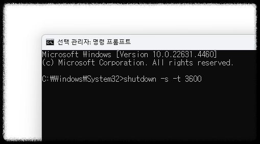 명령어 수행 시 shutdown -s -t [초] 를 입력해서 컴퓨터가 3,600초(60분) 뒤에 자동 종료되는 것을 확인해 볼 수 있었습니다.