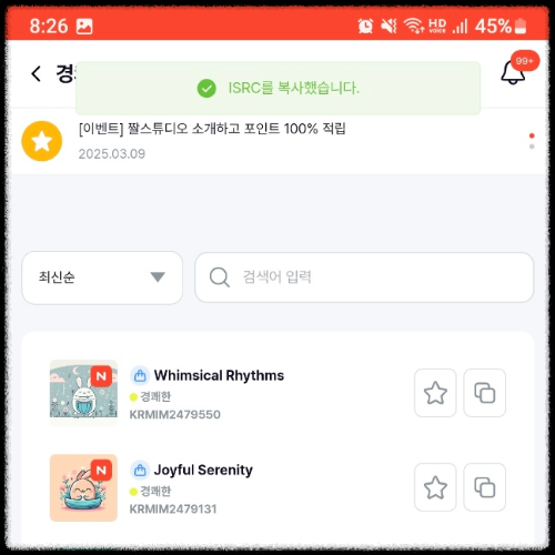 짤 스튜디오 APP을 사용해서 마음에 드는 음원을 색출하고 복사 아이콘을 선택해서 ISRC 코드를 가져올 수 있다. 위 화면에서 예를 들어본다면 "Whimsical Rhythms"의 ISRC 코드는 "KRMIM2479550"이 되는 셈이다. 여기까지 짤 스튜디오를 사용하는 방법에 대해 소개해보았다. 구독자 0명임에도 수익을 낼 수 있다는 강력한 조건을 내걸고 있는 만큼 해당 게시글 내용을 참고로 짤 스튜디오를 사용해 보길 바라며 이상, 포스팅을 마치도록 하겠다.