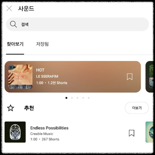 먼저, 모바일 내 유튜브에서 영상 업로드 화면으로 이동하면 상단에 [사운드 추가] 버튼을 위와 같이 확인해 볼 수 있다. 해당 버튼을 선택해 주도록 하자.